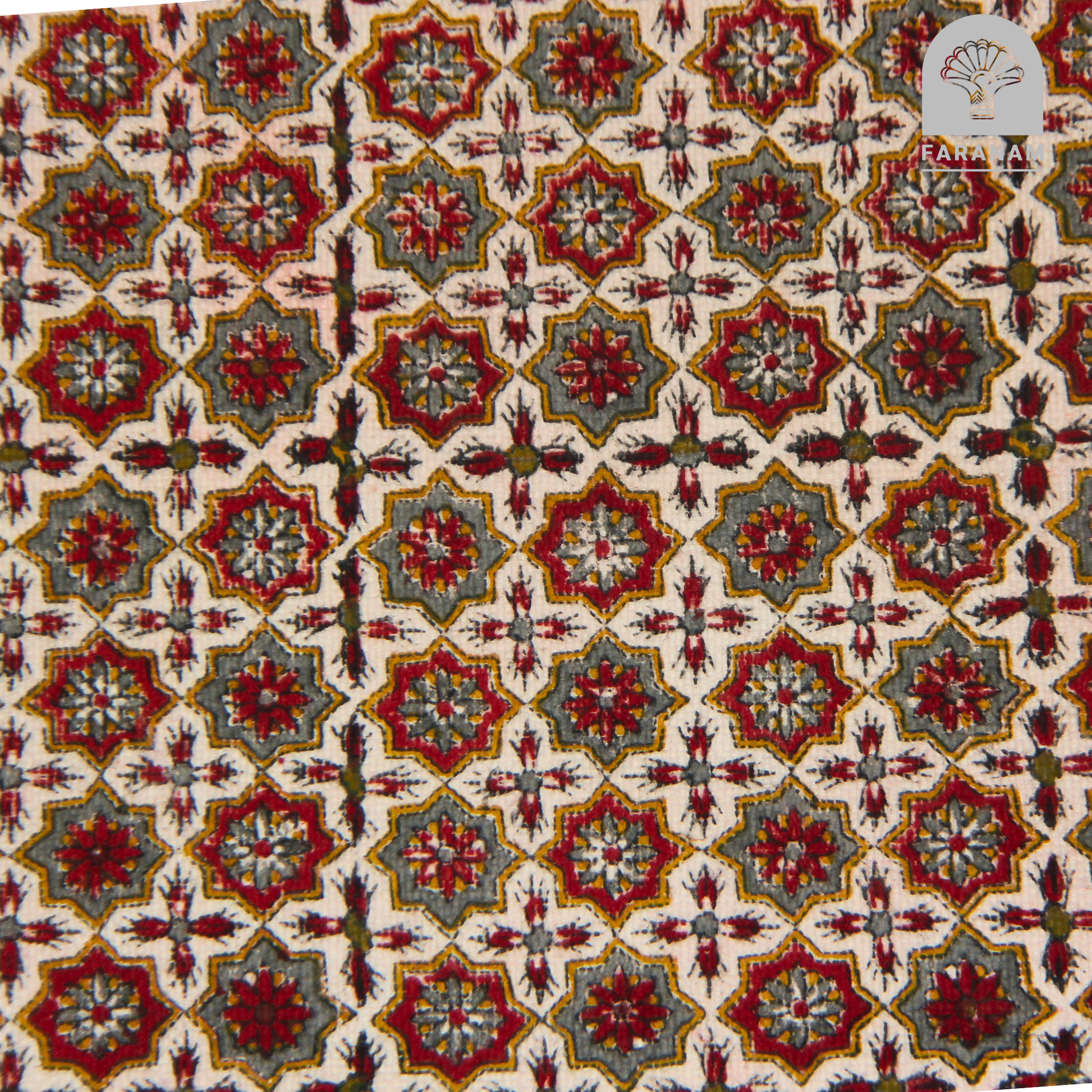 In Persian artistic tradition, geometric stars are more than decorative, they represent cosmic harmony and unity among all elements. The floral accents evoke themes of life’s continuous renewal, echoing the rich symbolism seen in classical Persian textiles and architecture.